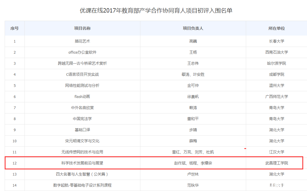 其中,武昌理工學(xué)院趙作斌、錢程、李耀宗老師申報的《科學(xué)技術(shù)發(fā)展前沿與展望》課程建設(shè)項目,經(jīng)過深圳大學(xué)深圳市優(yōu)課在線教育有限公司組織專家評審,已通過初評。一共有18項申報通過初評,武昌理工學(xué)院是該項目中唯一入選的民辦院校。