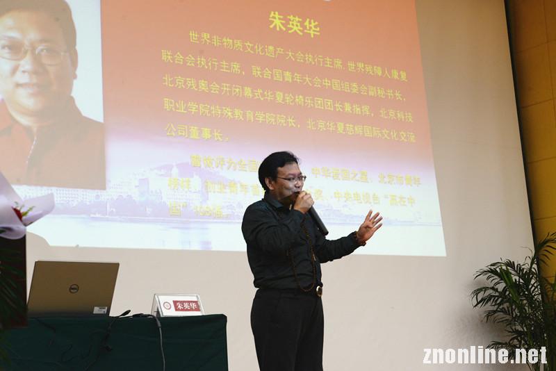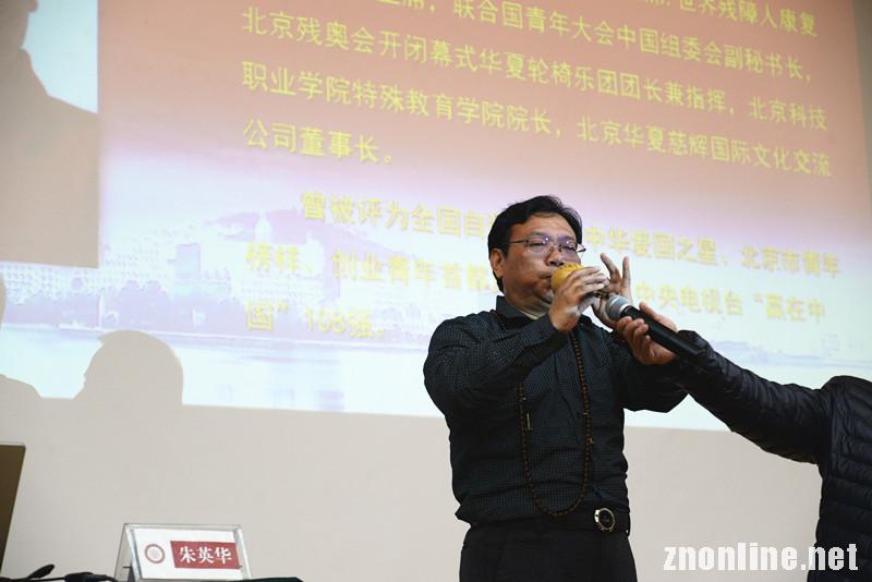 4日上午,朱英華在該校圖書館二樓功能報告廳進行了一場勵志報告會,300余名大學生到場聆聽。他用詼諧幽默的語言和學生們分享了他的成長經歷,腿部有殘疾的他身殘志堅,從被人諷刺為“瞎折騰”到被稱贊“能折騰”。其中特別提到組織華夏輪椅樂團參加北京殘奧會開閉幕式的經歷和《中國達人秀》全國總決賽冠軍劉偉的故事,他鼓勵同學們在追求夢想的過程中要目標明確和堅韌不拔。在擔任北京殘奧會開閉幕式華夏輪椅樂團團長時,為了能在殘奧會開幕式上完美演繹這支只有2分58秒的迎賓曲,他和學生們在八十多個日日夜夜里幾乎與世隔絕,汗水、淚水甚至血水鑄成了他們一生中最難以磨滅的、也是最輝煌的記憶。劉偉也正是在朱英華的鼓勵鞭策下,學會了腳彈鋼琴,實現了人生的飛躍。