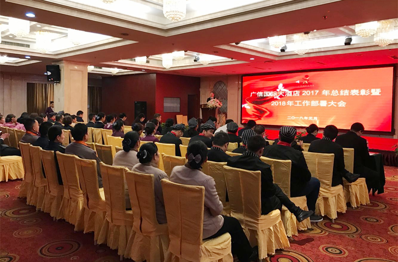 1月30日下午,廣信國際大酒店在酒店二樓廣信廳召開了2017年總結表彰暨2018年工作部署大會。酒店全體員工、管理人員參加了會議。