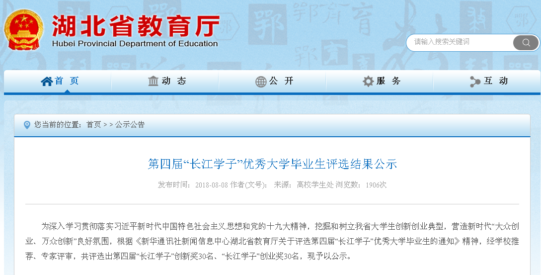 中南在線8月10日消息 日前,湖北省教育廳網站對第四屆“長江學子”優秀大學畢業生評選結果進行公示,經學校推薦、專家評審,共評選出第四屆“長江學子”創新獎30名、“長江學子”創業獎30名。武昌理工學院學生程添、呂建國均榮獲“長江學子”創業獎,全省僅30人獲此殊榮,武昌理工學院也是獲獎人數最多的高校之一。