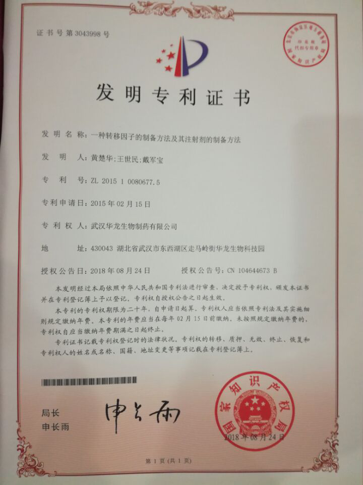 近期,武漢華龍生物制藥有限公司研發的“一種轉移因子的制備方法及其注射劑的制備方法”喜獲國家知識產權局頒發的發明專利證書。該發明由公司副總經理,總工程師黃楚華領銜,質量總監王世民,戴軍寶參加的新藥研發團隊歷經多年努力取得新突破。