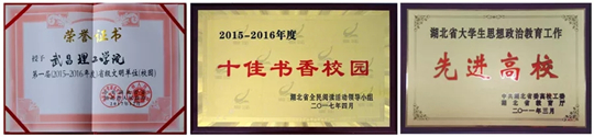 學校被中共湖北省委、湖北省人民政府授予“省級文明校園”,榮獲“湖北省十佳書香校園”、“湖北省大學生思想政治教育工作先進高校”等榮譽稱號。