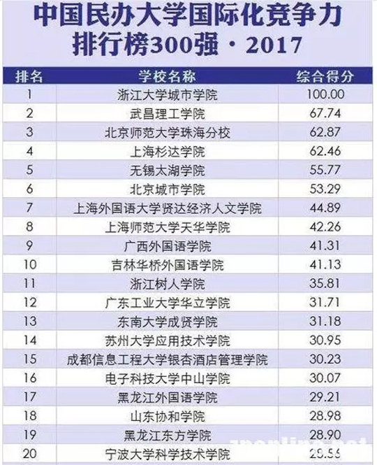在各種排名中一直位居前列,在2012年“中國大學本科教育排行榜”位居全國本科高校第144位。位居騰訊網“品牌實力民辦大學”第一名、網易教育“就業競爭力高校”第一名、央廣網“中國影響力民辦高校”第一名、新浪網“最具品牌影響力民辦高校”第一名等眾多榮譽。多次入選“全國高校畢業生就業競爭力100強”。