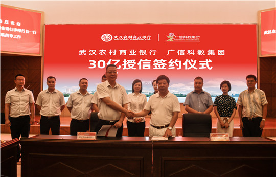 7月3日,武漢農村商業銀行與廣信科教集團30億授信簽約儀式在廣信科教集團隆重舉行。武漢農村商業銀行總行副行長李樺,廣信科教集團董事局主席、總裁,武昌理工學院校長趙作斌發表重要講話,武漢農村商業銀行青山支行行長祝勁松與趙作斌總裁代表雙方簽約,儀式由集團董事局副主席、副總裁呂驊燕主持。