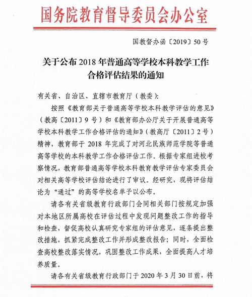 近日,國務院教育督導委員會辦公室正式發布了《關于公布2018年普通高等學校本科教學工作合格評估結果的通知》(國教督辦函〔2019〕50號),武昌理工學院順利通過教育部本科教學工作合格評估,這是武昌理工學院發展史上具有里程碑意義的重大事件,標志著學校發展邁向了新臺階、開啟了新征程、進入了新時代。