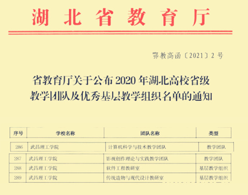 近日,湖北省教育廳發布《關于公布2020 年湖北高校省級教學團隊及優秀基層教學組織名單的通知》(鄂教高函〔2021〕2號),武昌理工學院人工智能學院計算機科學與技術教學團隊、影視傳媒學院影視創作理論與實踐教學團隊獲批為202O年湖北高校省級教學團隊,人工智能學院軟件工程教研室、藝術設計學院傳統造物與現代設計教研室獲批為2020年湖北高校優秀基層教學組織。武昌理工學院獲批數量在全省同類高校中排名第一。