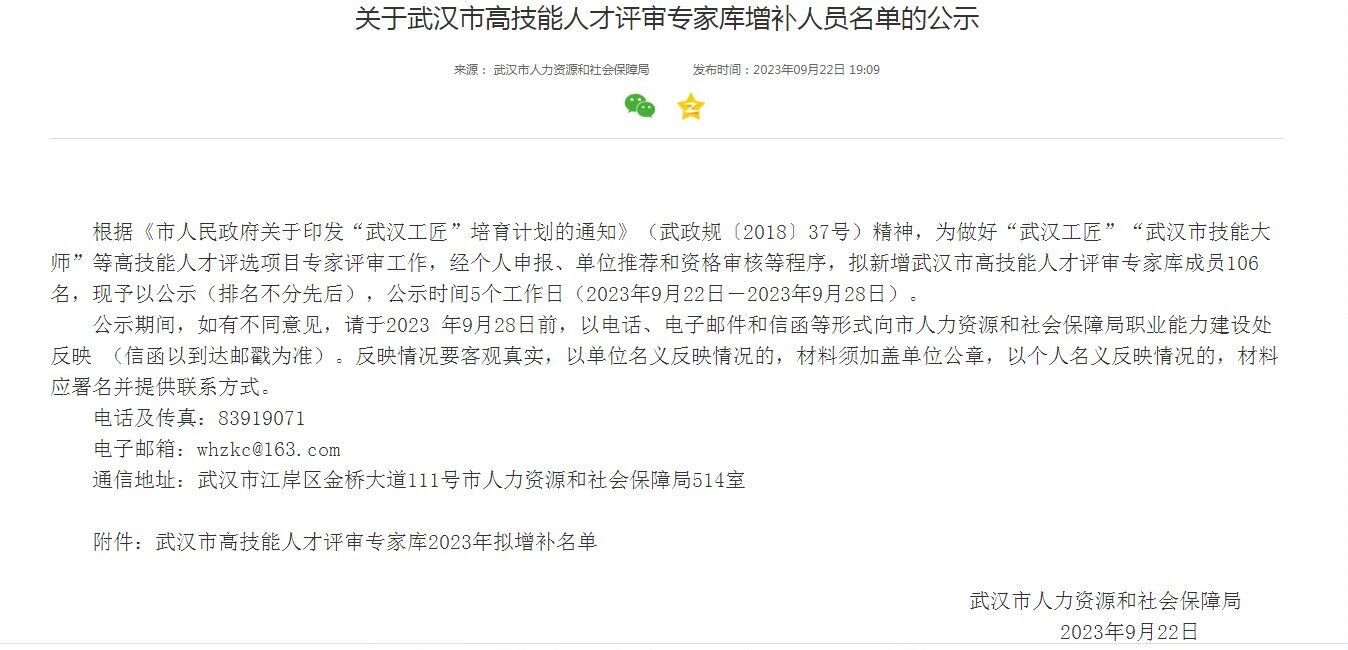 根據(jù)《市人民政府關于印發(fā)“武漢工匠”培育計劃的通知》(武政規(guī) (2018] 37號)精神,為做好“武漢工匠”“ 武漢市技能大師”等高技能人才評選項目專家評審工作,經(jīng)個人申報、單位推薦和資格審核等程序,擬新增武漢市高技能人才評審專家?guī)斐蓡T106名。