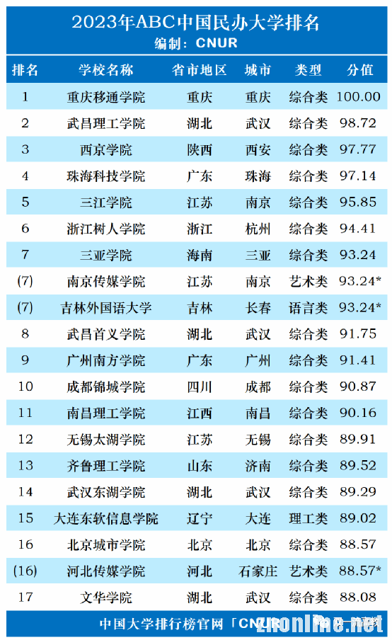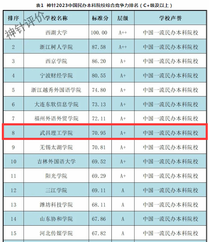 4月13日,2023年ABC中國民辦大學排名、中國民辦大學評級于中國大學排行榜官網(wǎng)(CNUR)正式發(fā)布。武昌理工學院位居中國民辦大學排名第二,湖北省民辦高校第一。2023年中國民辦大學評級A++類為最高等級,共有20所院校上榜,武昌理工學院成功上榜。此外,在高等教育專業(yè)評價機構軟科正式發(fā)布的“2023軟科中國大學排名”中,武昌理工學院榮獲中國民辦大學綜合排名10強。