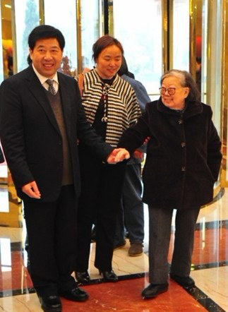 原國家主席李先念夫人林佳楣女士(右)視察廣信科教集團時與趙作斌總裁親切交談